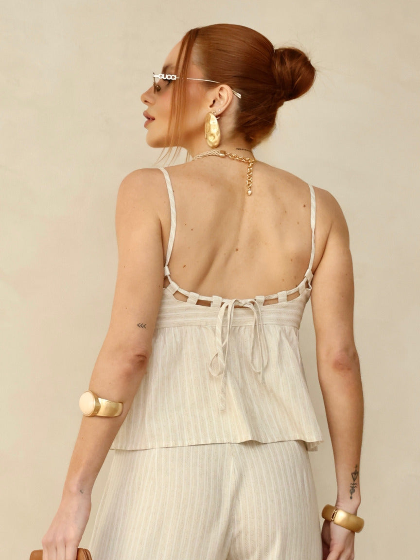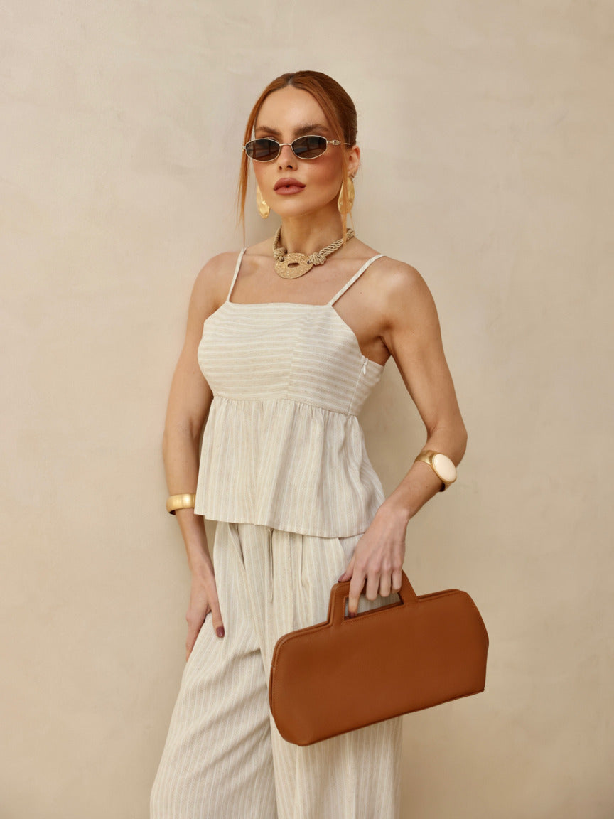 Com estilo resort chic, ela combina facilmente com shorts, saias ou calças de linho, criando looks femininos, modernos e cheios de personalidade — ideal para o dia a dia ou momentos de lazer com sofisticação.