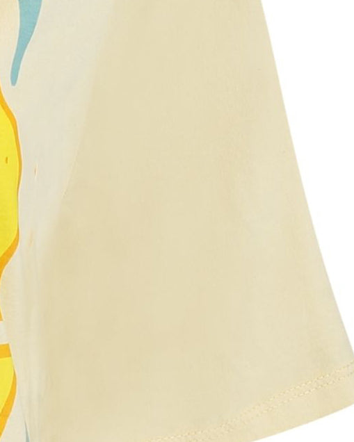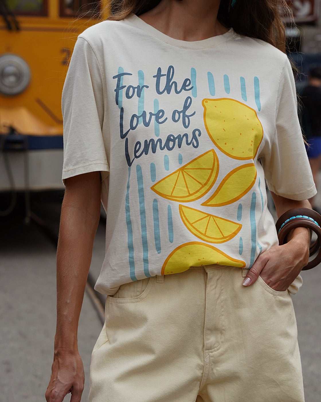 A frase “For the Love of Lemons” e os desenhos de limões em amarelo vibrante reforçam o mood tropical e divertido da temporada, ideal para quem ama moda casual com toque criativo.