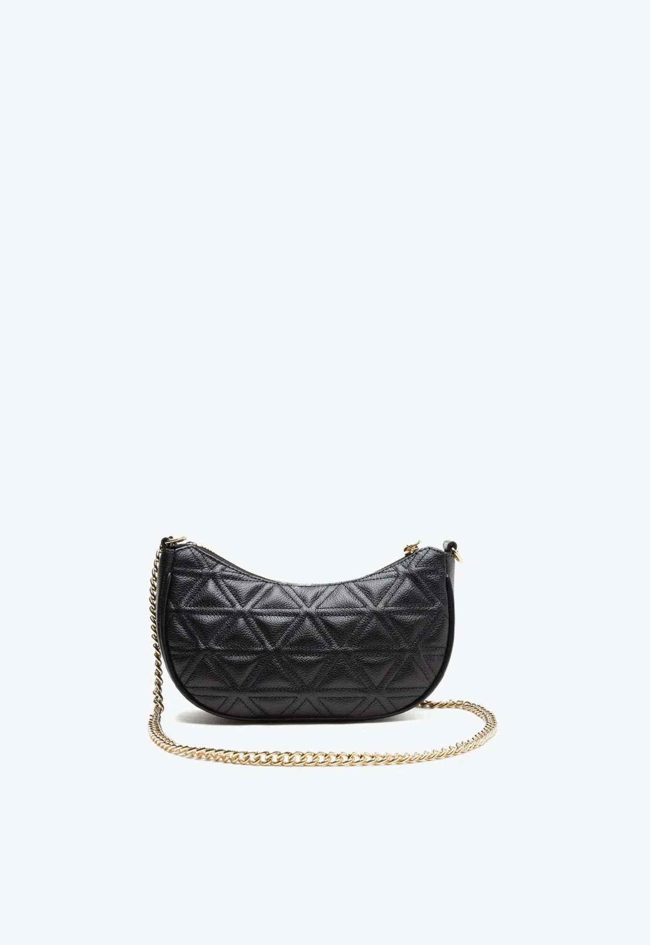 Matelassê Geométrico – O acabamento em couro com costuras que formam triângulos texturizados adiciona profundidade e um toque sofisticado ao design preto clássico.