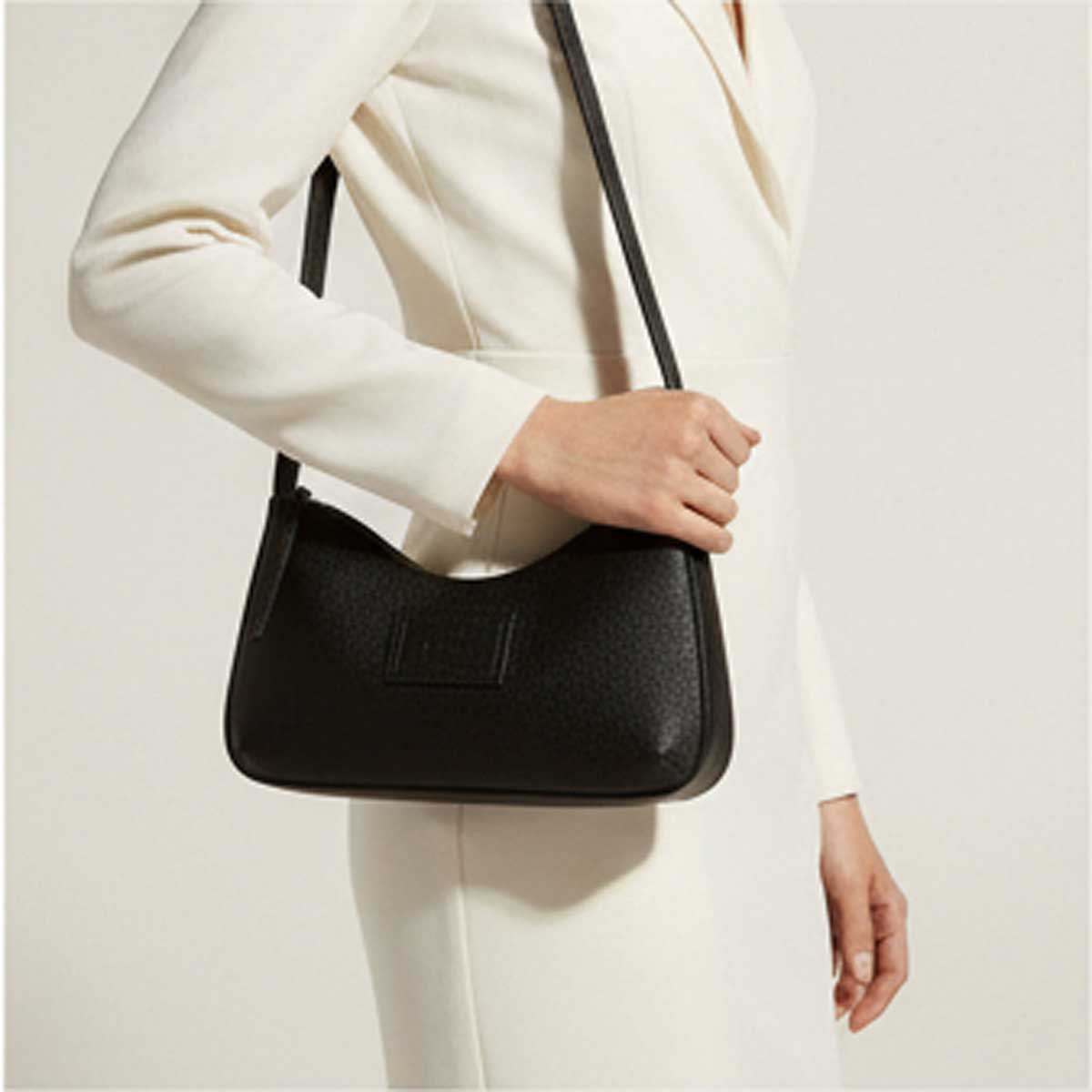 A Bolsa Shoulder SCHUTZ é a tradução perfeita do estilo "cool sem esforço". Com sua silhueta curvilínea e compacta, inspirada na icônica tendência das baguette bags dos anos 90, ela traz um ar retrô modernizado que eleva qualquer produção. O acabamento em couro preto confere elegância atemporal, enquanto o logo SCHUTZ em relevo na parte frontal (tag de couro) adiciona uma assinatura discreta e sofisticada. Sua alça de ombro com fivela ajustável permite personalizar a altura, garantindo conforto e versatilidade. Ideal para transitar do office look ao happy hour, ela acomoda seus essenciais com segurança graças ao fechamento por zíper superior.