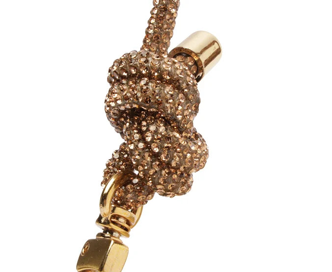 Uma alça curta de ombro com manta de strass e detalhe de nós nas extremidades, com ponteiras metálicas e fecho por mosquetão removível.