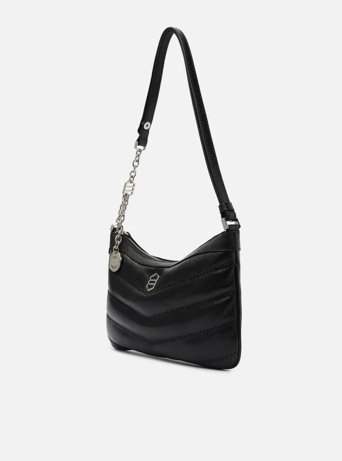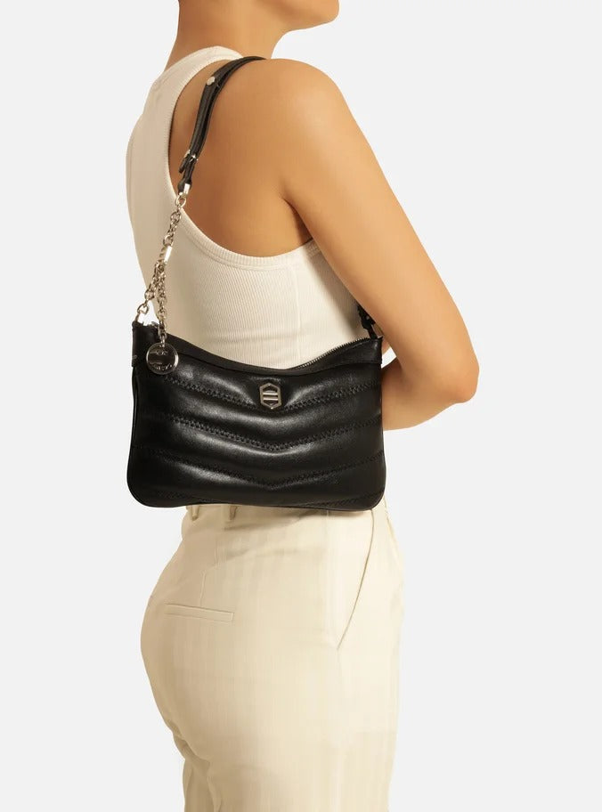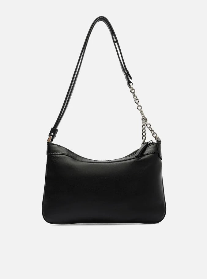 A alça curta de ombro em couro é combinada a uma corrente metálica com ajuste, permitindo o uso no ombro ou na transversal.