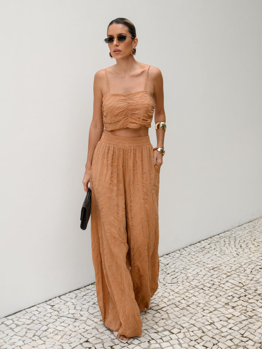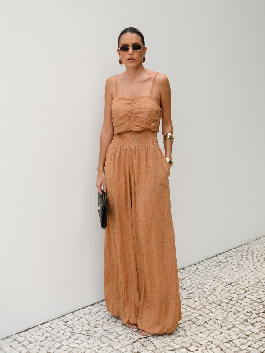 Modelagem Aladim – Calça ampla de cintura alta com elástico embutido e top cropped franzido com alcinhas finas, valorizando a silhueta feminina.