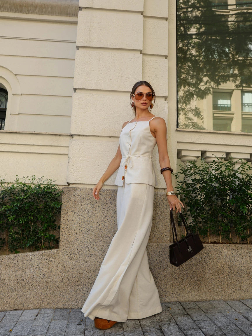 Com caimento fluido, cintura alta e detalhe de nesga que valoriza o movimento, ela garante um visual alongado, sofisticado e extremamente feminino.