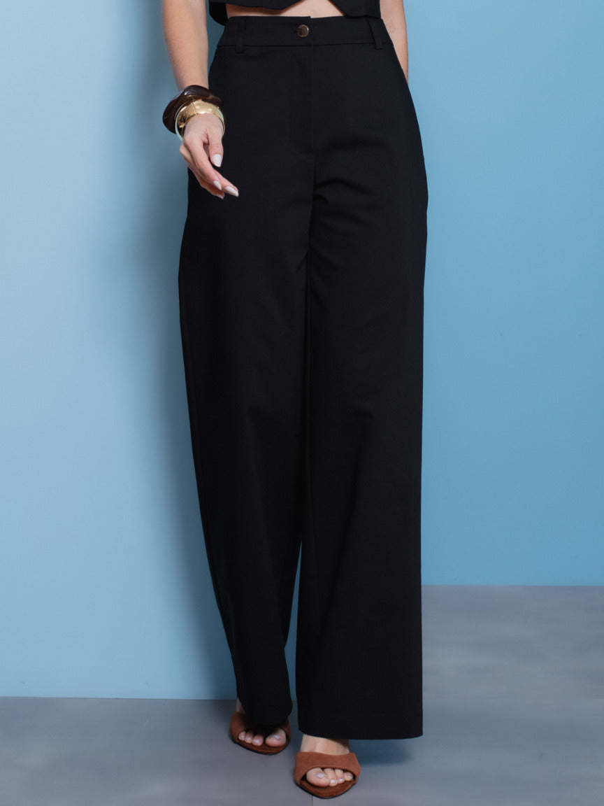 Design Clássico e Elegante – Modelagem reta com bolsos funcionais frontais e traseiros, cós estruturado com passantes e fechamento por zíper e botão dourado frontal.