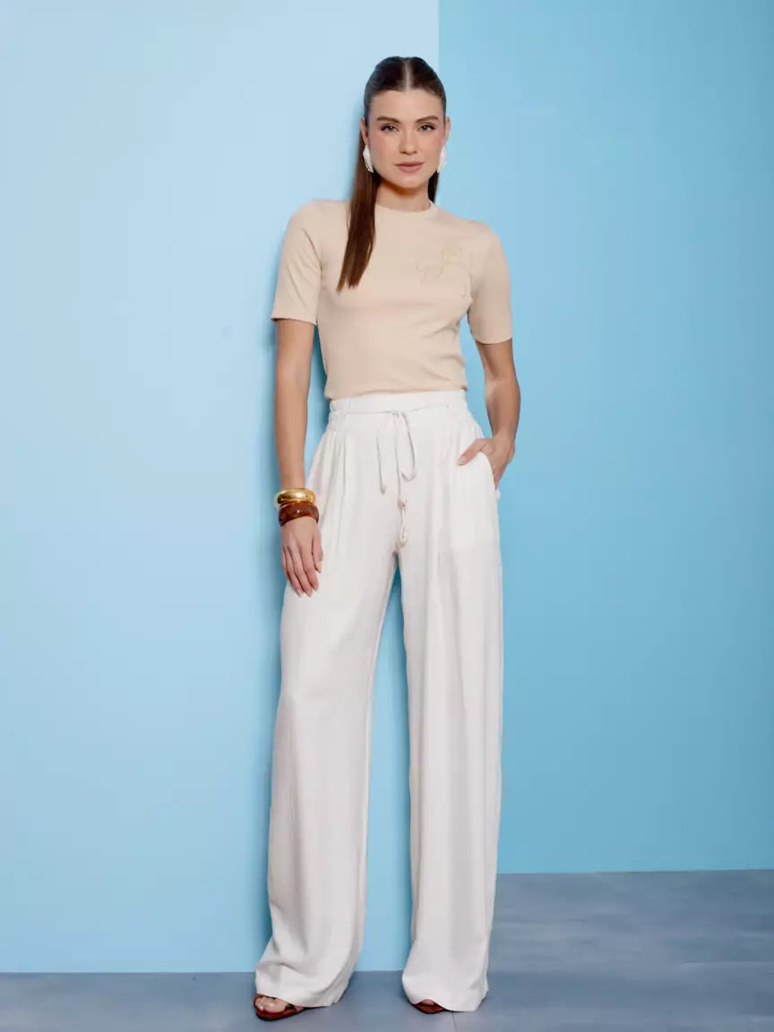 Design Versátil – Cós elástico com amarração e ponteiras, bolsos funcionais e modelagem reta que alonga a silhueta com elegância.