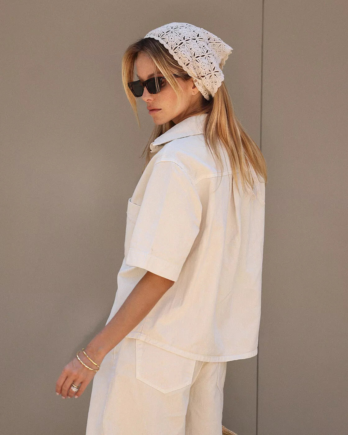 Seu jeans leve e confortável oferece caimento perfeito, permitindo usar aberta como terceira peça, fechada, por dentro da calça, com amarração frontal ou até em sobreposições.