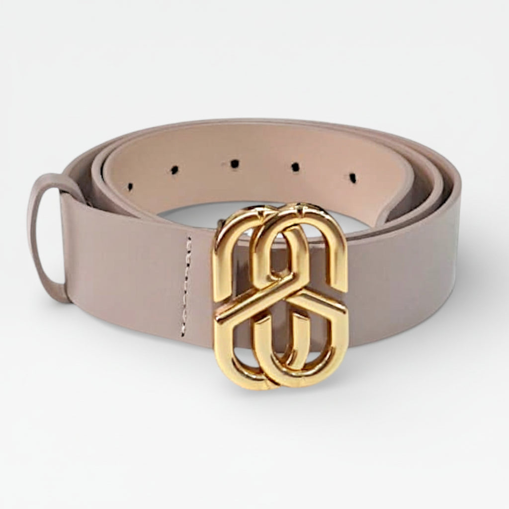 Fivela SS Logo – Metais dourados entrelaçados formando o icônico logo "SS",assinatura de estilo da marca.