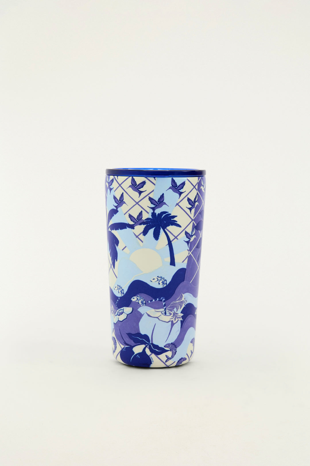 Com uma estampa artística em tons de azul, inspirada em paisagens tropicais e elementos naturais, ele traz um visual elegante e super diferente — ideal para deixar sua rotina mais bonita.