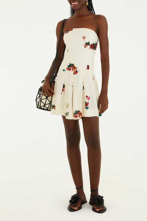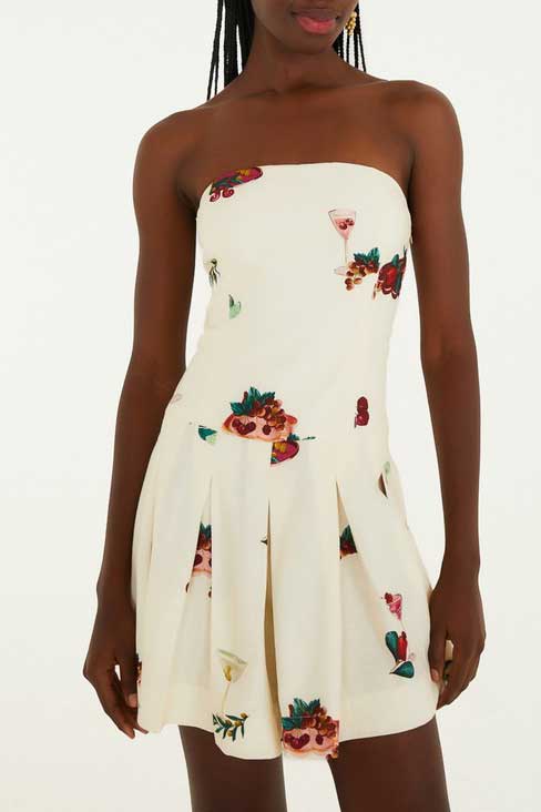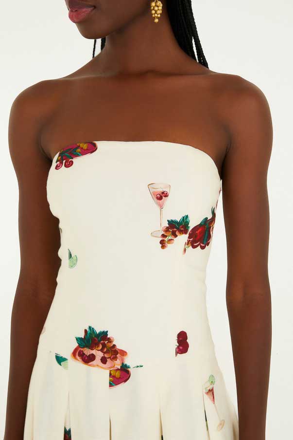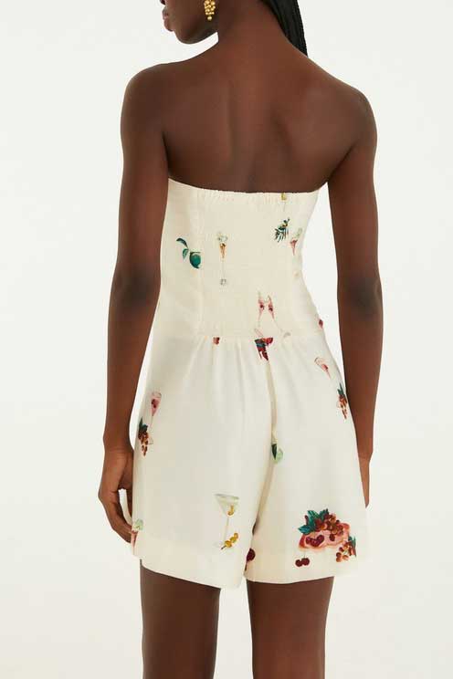 Este macaquinho é a roupa perfeita para celebrar a vida. Com uma estampa divertida que mistura taças de vinho, drinks e uvas, ele tem a leveza e o charme para ocasiões especiais. O corte tomara que caia com a saia plissada cria uma silhueta feminina e super moderna. Ideal para um coquetel, uma festa durante o dia ou para ser a estrela da sua próxima viagem