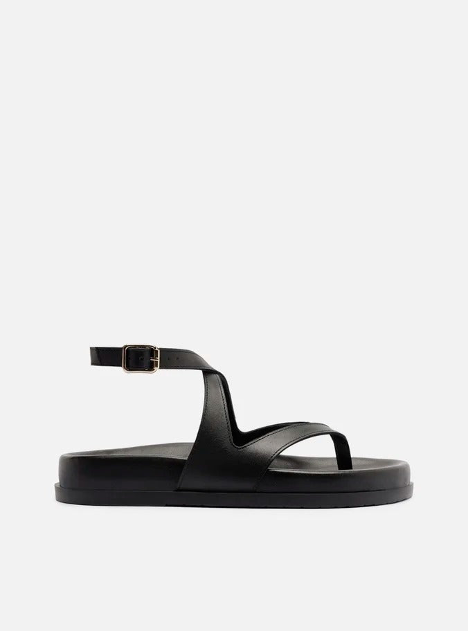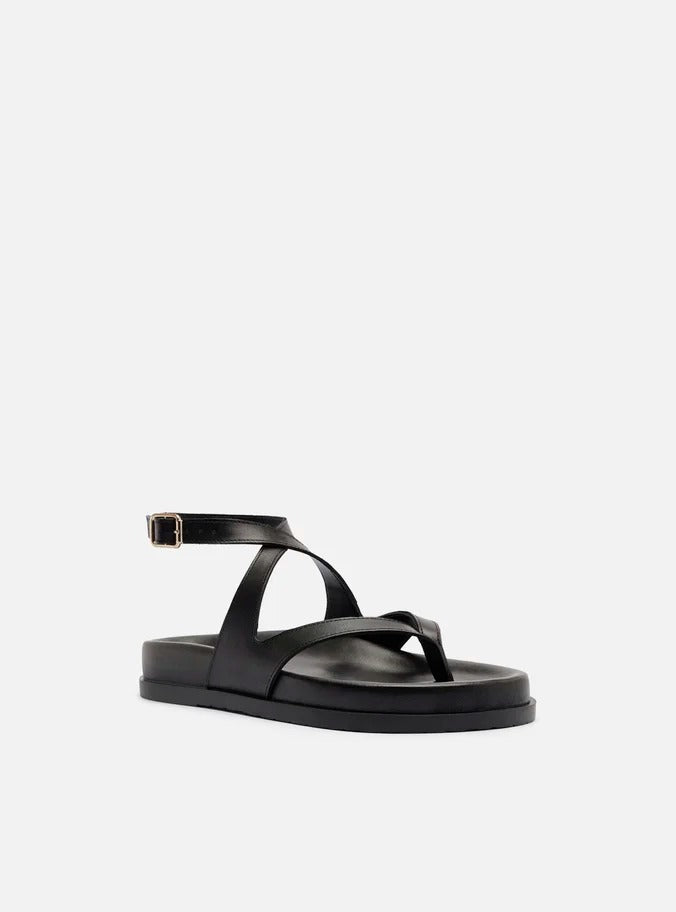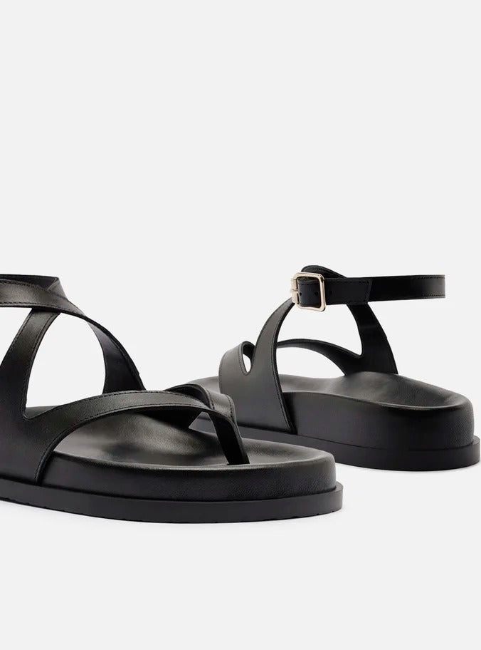 Apresenta bico arredondado, tira central que divide os dedos e tiras laterais cruzadas que contornam o tornozelo, fechando em fivela metálica lateral para melhor ajuste.