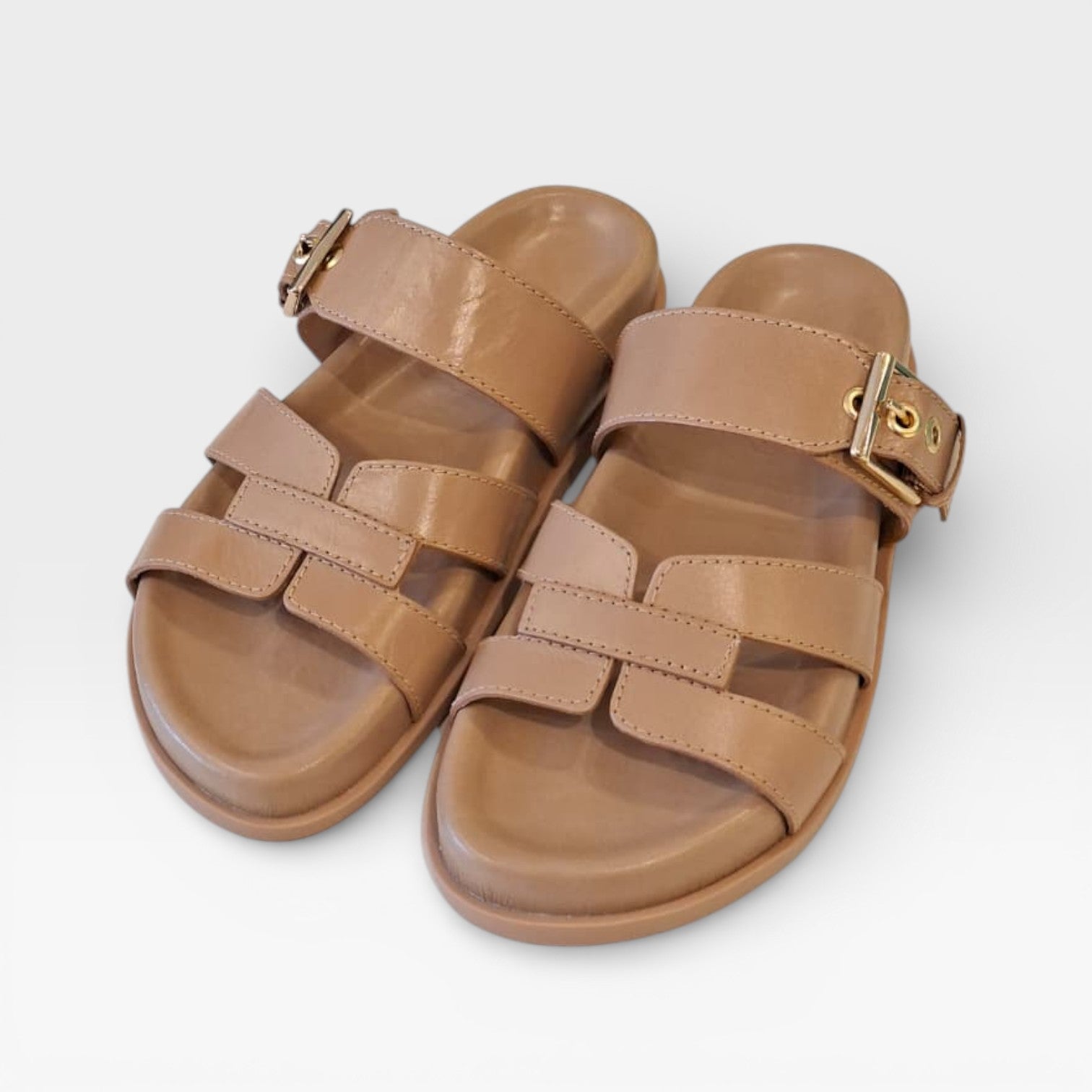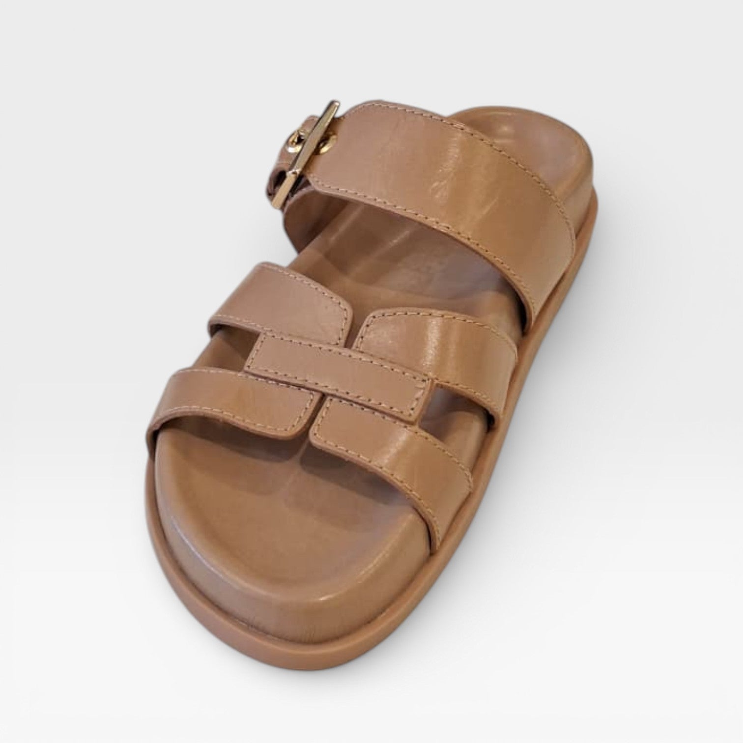 A Sandália Papete Slide SCHUTZ é a definição de easy chic para a temporada. Combinando o conforto da palmilha anatômica com a sofisticação do couro em tom bege (amêndoa), ela é versátil e elegante na medida certa. O destaque fica por conta da tira superior com fivela dourada quadrada e ilhós metalizados, que trazem um toque de brilho e modernidade ao design minimalista. A tira frontal com detalhe de passador adiciona textura e charme extra. Perfeita para quem busca praticidade sem abrir mão do estilo, ela transita do office look descontraído com alfaiataria de linho aos passeios de fim de semana com vestidos fluidos e jeans.