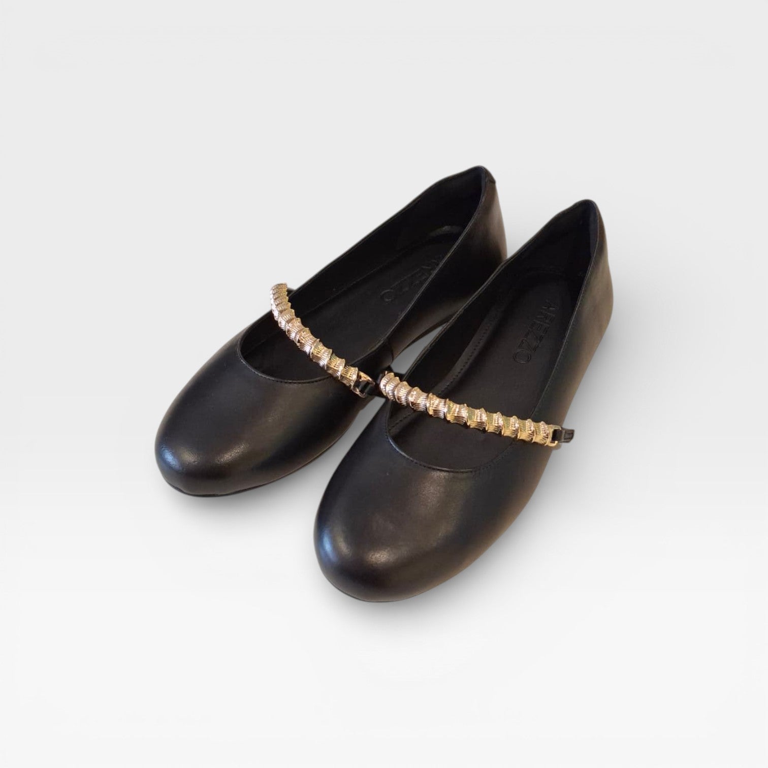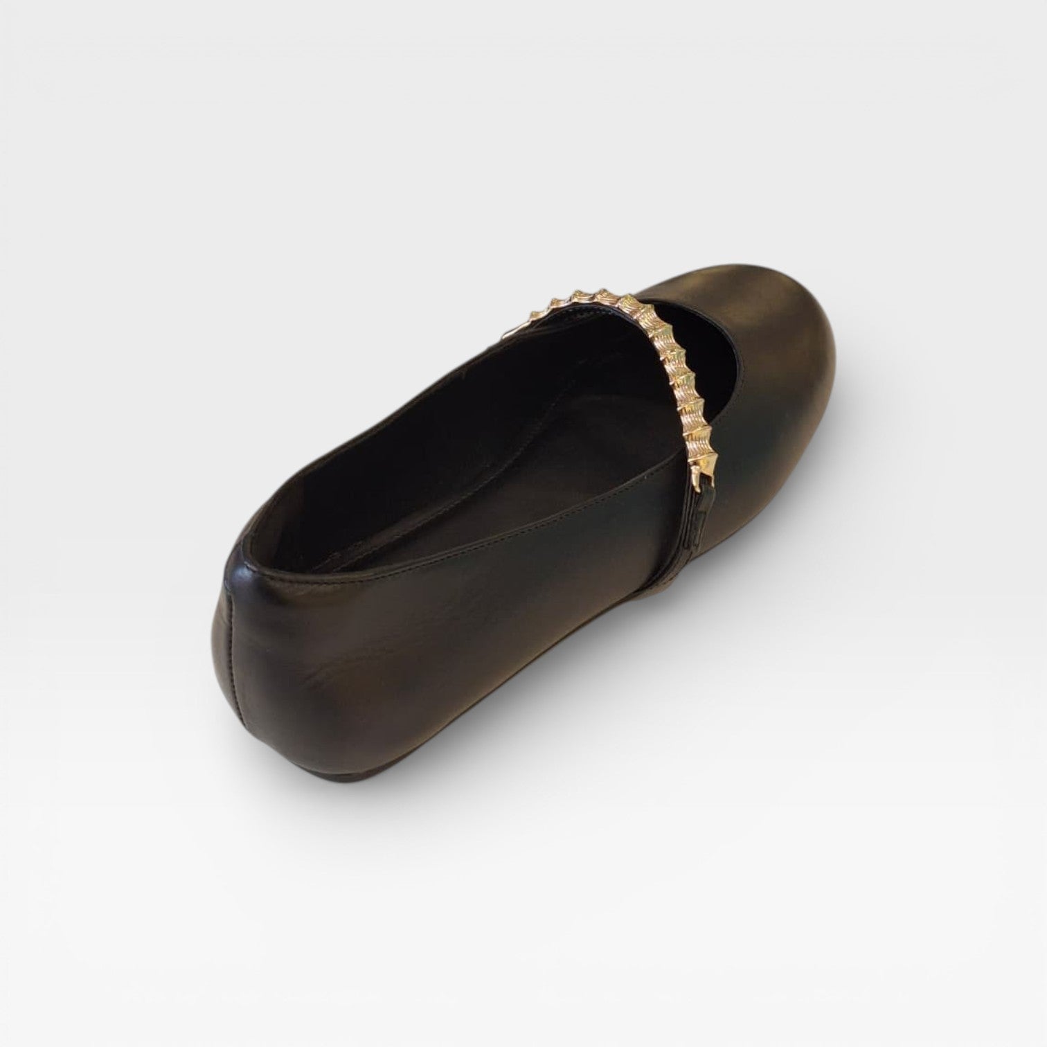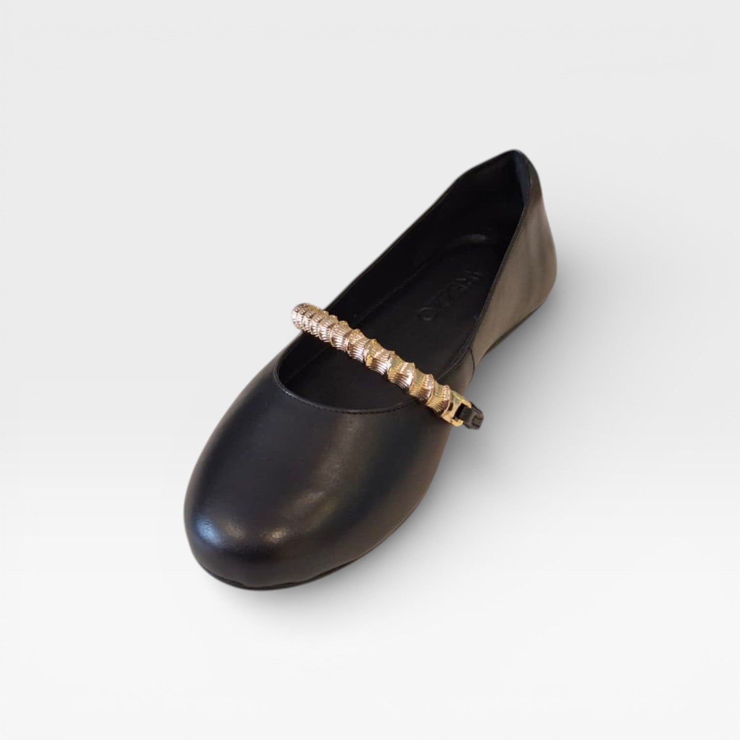 A Sapatilha Flat SCHUTZ é a prova de que o básico pode ser extraordinário. Reinterpretando o clássico modelo bailarina, ela ganha um toque de modernidade e sofisticação com a aplicação da corrente dourada sobre o peito do pé, criando um contraste luxuoso com o couro preto. O bico redondo e o solado rasteiro garantem conforto para o dia todo, sem perder a elegância. Versátil, ela transita perfeitamente do escritório, combinada com alfaiataria, aos momentos de lazer com jeans e camisa, sendo a peça-chave para quem busca um visual chic sem esforço.