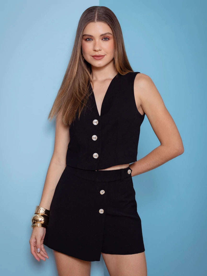 Detalhes Sofisticados – Abotoamento frontal em botões elegantes e fechamento por zíper.