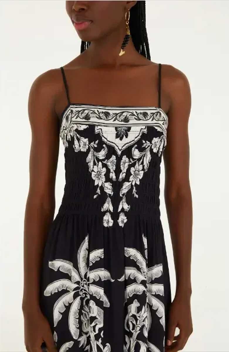 Com caimento fluido e estampa exuberante, é ideal para os dias de sol, viagens e momentos especiais, traduzindo o espírito leve e autêntico da FARM Rio.