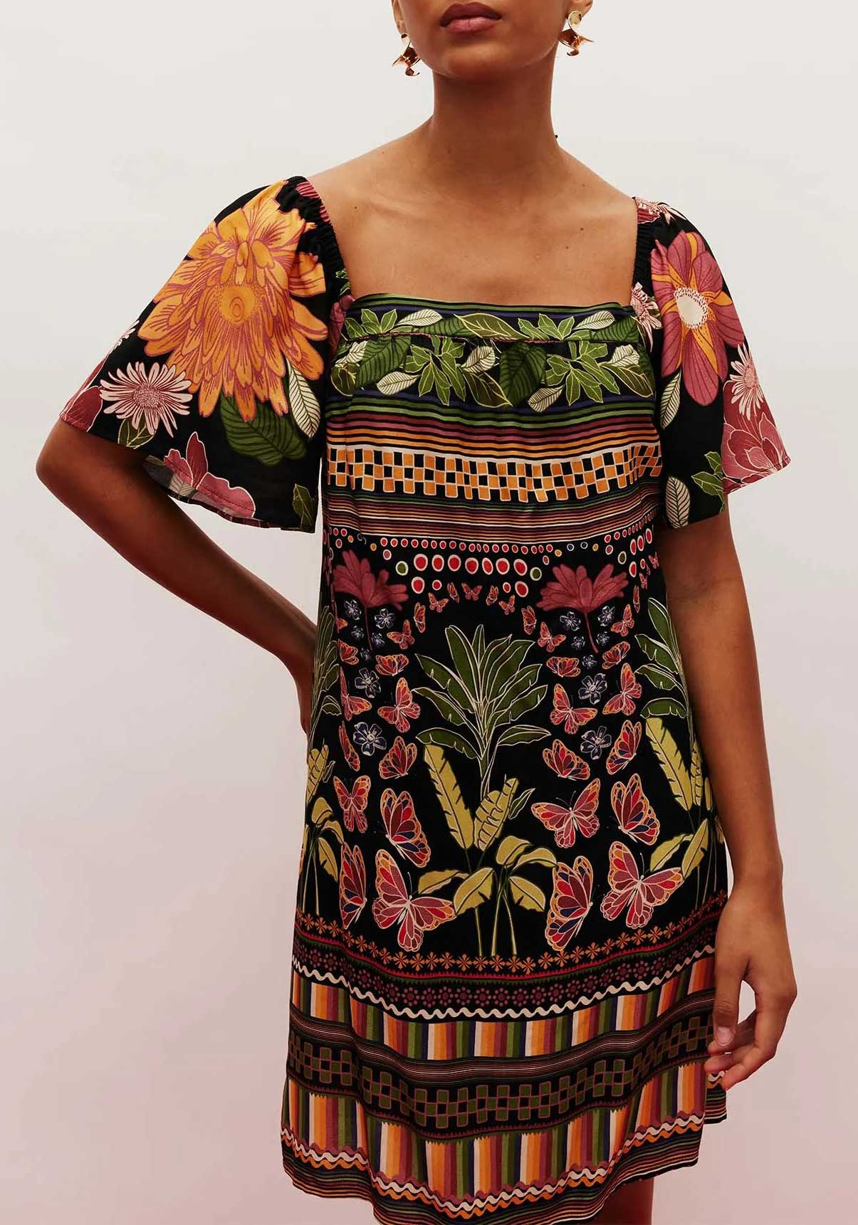 Modelo encantador, o vestido curto é confeccionado em tecido 100% viscose e possui decote quadrado com manga curta solta. Possui amarração com ajuste nas costas e lastex para melhor ajuste ao corpo.