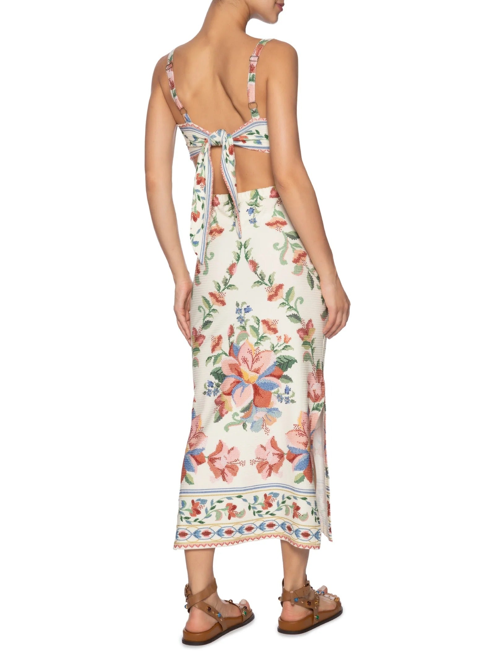 Os recortes laterais e posterior vazados adicionam sensualidade na medida certa, enquanto o mix de flores em cores contrastantes traduz a essência alegre e colorida da FARM Rio.